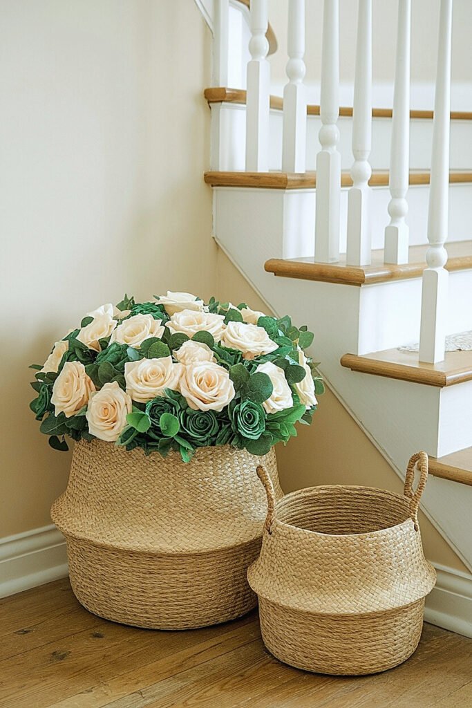 Group two or three baskets of varying sizes, stacking or clustering near your landing’s corner. Fill only the largest with roses; leave others empty or holding complementary items like candles or decorative balls. The basket grouping creates compound presence while the rose focus prevents overcrowding.