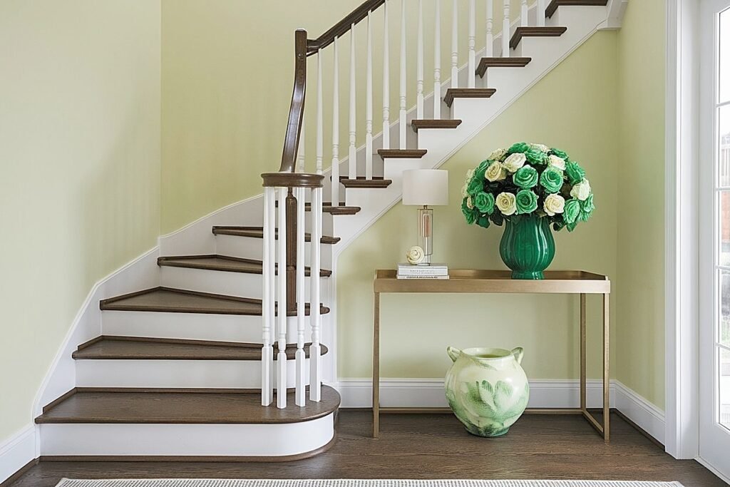 Console tables on landings create dedicated decorating surfaces where none existed before. These narrow tables fit against walls without obstructing stair traffic, providing platforms for substantial displays that floor placement couldn’t safely accommodate. For St. Patrick’s Day, a landing console becomes the perfect stage for green-themed rose arrangements visible from every approach.