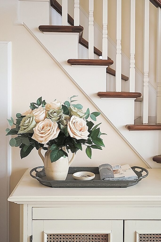 Build your display in layers. Position the largest element, your main rose arrangement, at center back, against the wall. Add secondary elements at varying distances forward, creating depth that flat arrangements lack. The layered approach suits the sideboard’s proportions while creating visual interest from stair approach angles.