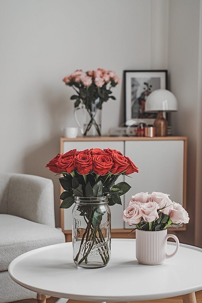 Cut stems progressively shorter for each zone. Main arrangement roses stay tallest at ten inches. Secondary arrangement cuts to seven inches. Small accent vessels trim to four or five inches. This graduated approach ensures proper proportion for different vessel sizes while creating variety across your space. Each location feels intentionally decorated rather than obviously subdivided from one source. Your grocery investment now creates Valentine atmosphere in every room you enter. For even more ways to extend grocery roses throughout your apartment, explore these tiny apartment Valentine garlands made from grocery-store roses that maximize flower budgets dramatically. Found this approach helpful? Share it with friends planning their own budget Valentine setup!