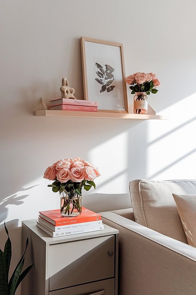 - Pairing roses with existing decor items like books and frames creates curated vignettes without additional cost