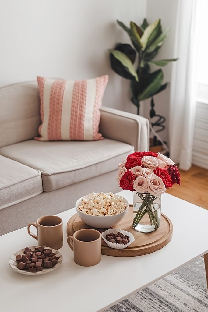 Add roses as board accessories rather than separate decoration. Tuck a bud vase at one corner of your snack spread. Scatter loose petals across empty board spaces. Position a single bloom in a small vessel beside the serving area. The flowers transform humble snacks into Valentine experience without requiring expensive food upgrades. Curl up together, press play, and enjoy a romantic evening that cost less than a single restaurant appetizer.