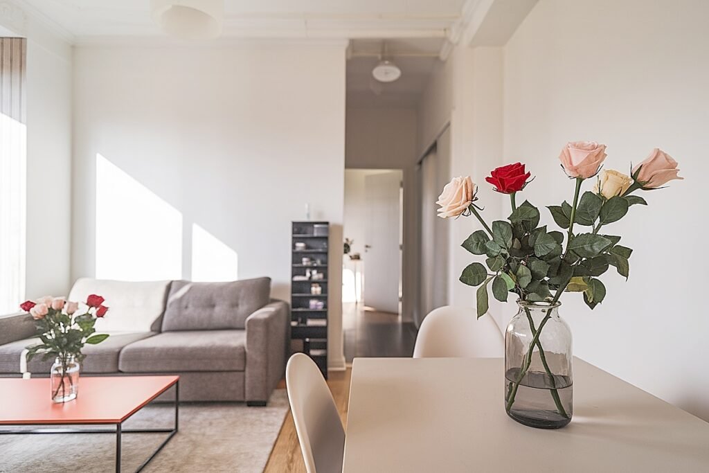 - One grocery store bouquet strategically divided decorates an entire small apartment across multiple zones