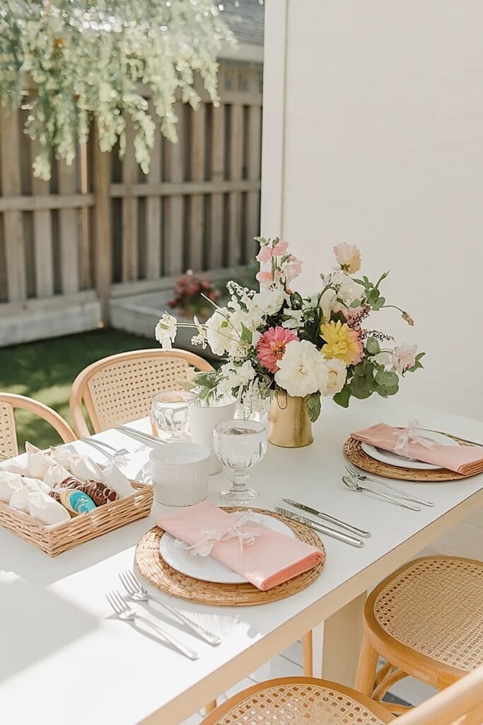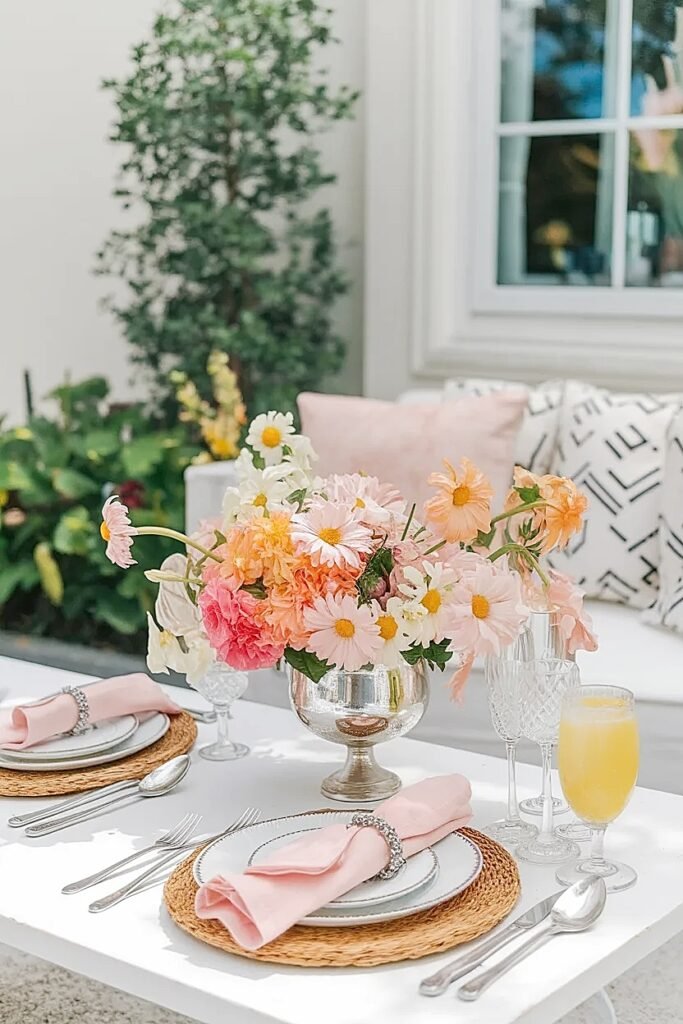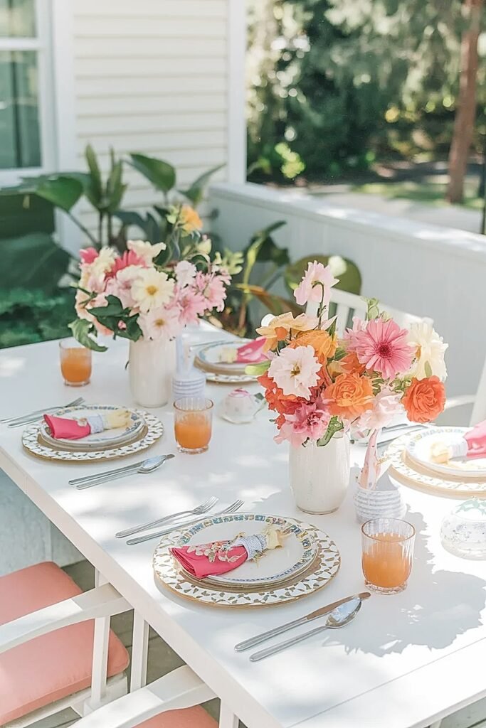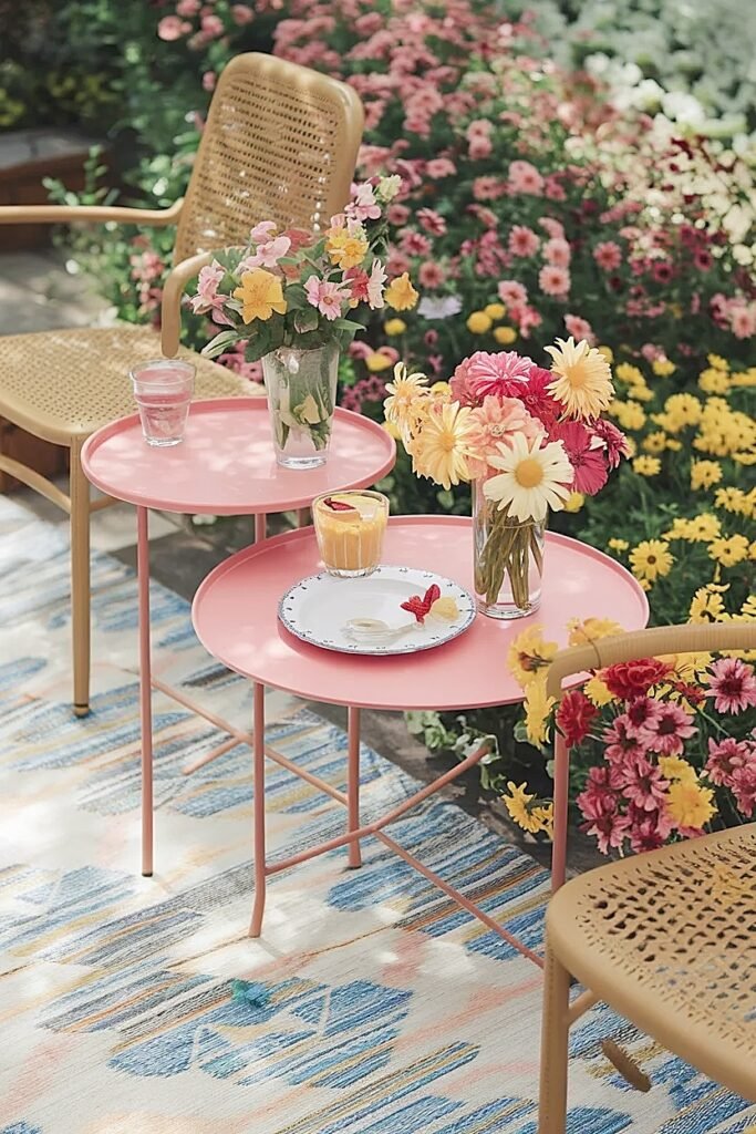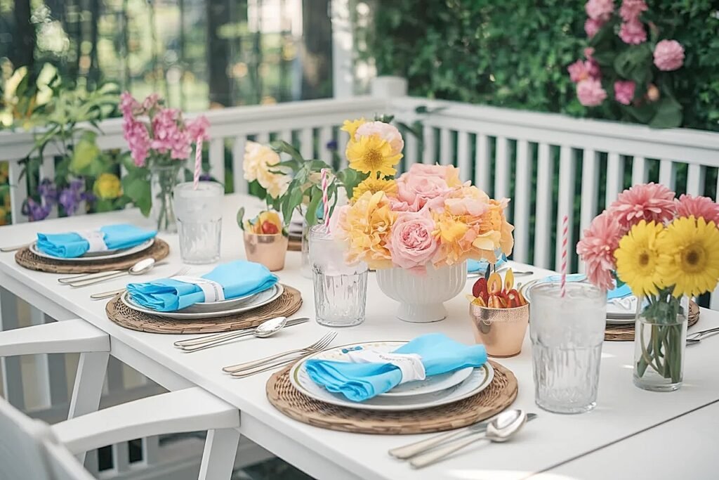 Color coordination between the welcome table and the main patio table flowers creates a visual thread that makes a small backyard patio feel genuinely designed rather than assembled. They do not need to be identical arrangements, just in the same color family: all warm and vivid, or all soft and cool, or all one single color. That consistency across surfaces is the detail that separates a backyard birthday that looks professionally styled from one that looks like individual decisions made independently.
