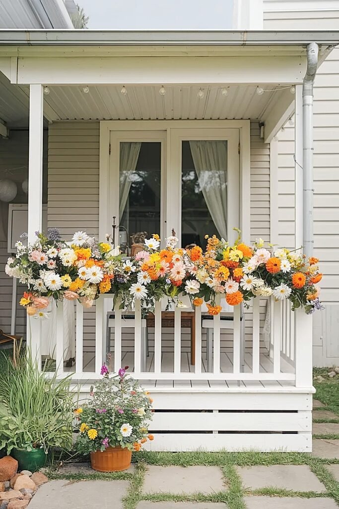 Color choice at the railing is a different decision from color choice at the table. The railing is viewed from a distance and photographs as a backdrop. Warm, vivid tones work best: deep coral zinnias, vivid orange marigolds, bright yellow sunflowers. Those colors hold their presence in outdoor photographs and against the typical fence, wall, or garden background that most small backyard patios have behind the railing.