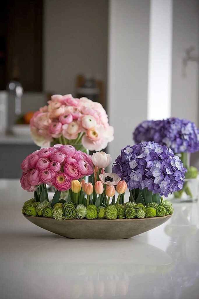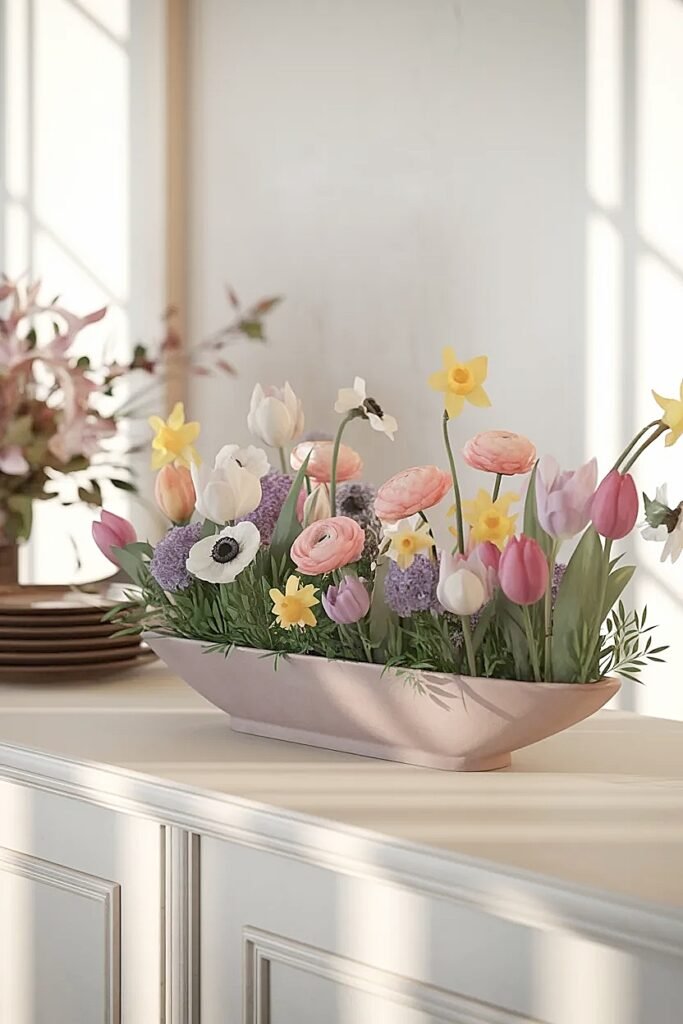 Ideas for Wide Spring Flowers Centerpieces on Sideboards Using a Single Low Trough