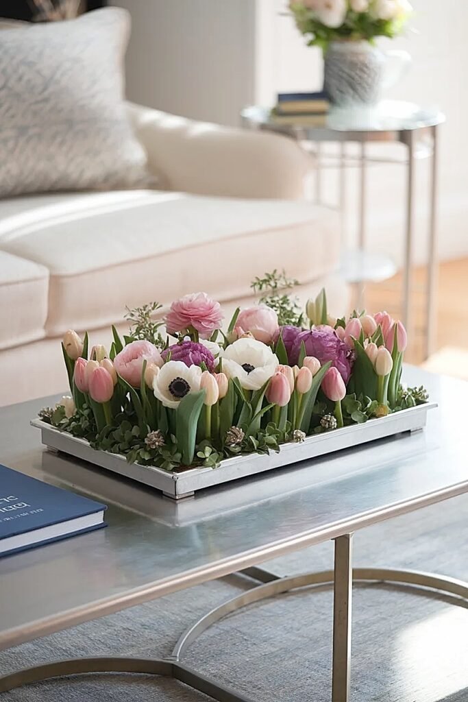 How to Build Spring Flowers Wide Centerpieces in Low Trays for Coffee Tables (Drink Space)