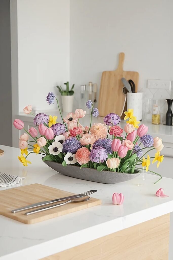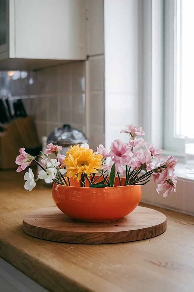 Position an 18×6 inch trough along island’s back edge against any wall or backsplash, creating linear floral presence while leaving entire front area clear for prep work. Fill with 10-12 grocery store stems cut to 5-7 inches creating low horizontal arrangement. The back positioning means it’s visible but never in the way during cooking. Cost: $10-12 for flowers plus a repurposed baking dish or $15-20 thrift store trough.
