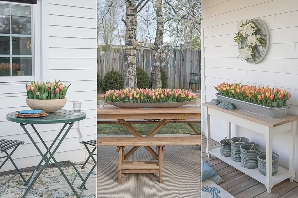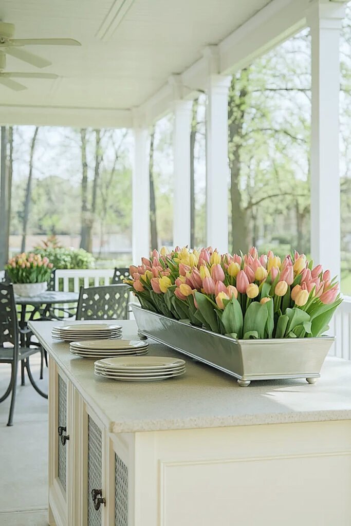 Ideas for Trough Centerpieces vs Oval Dishes for Spring Tulips Patio Centerpieces on Outdoor Counters