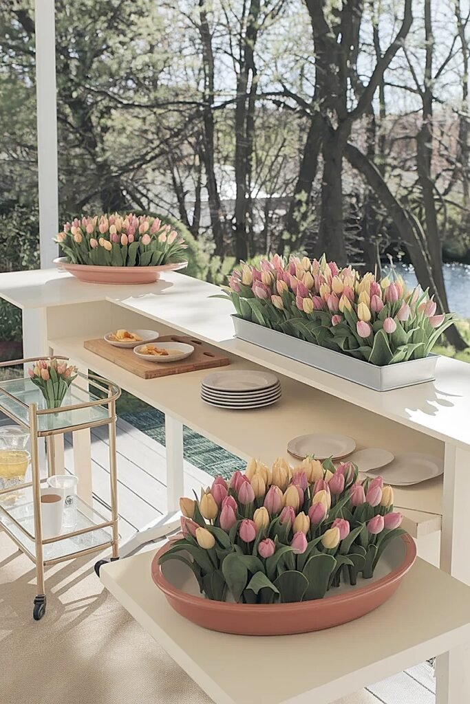 Ways to Use Low Rectangular Troughs for Spring Tulips Patio Centerpieces on Buffets