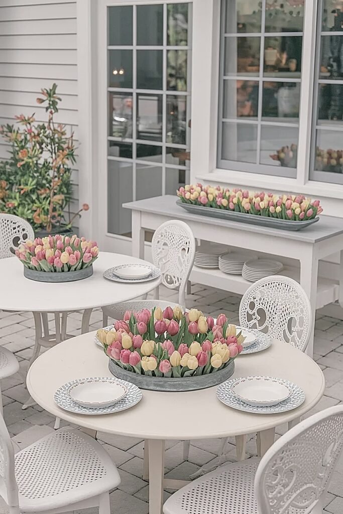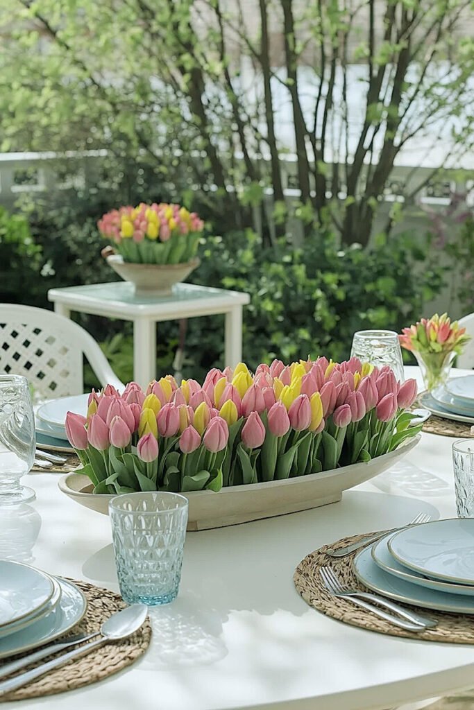 Ideas for Low Oval Dishes as Spring Tulips Patio Centerpieces on Long Dining Tables