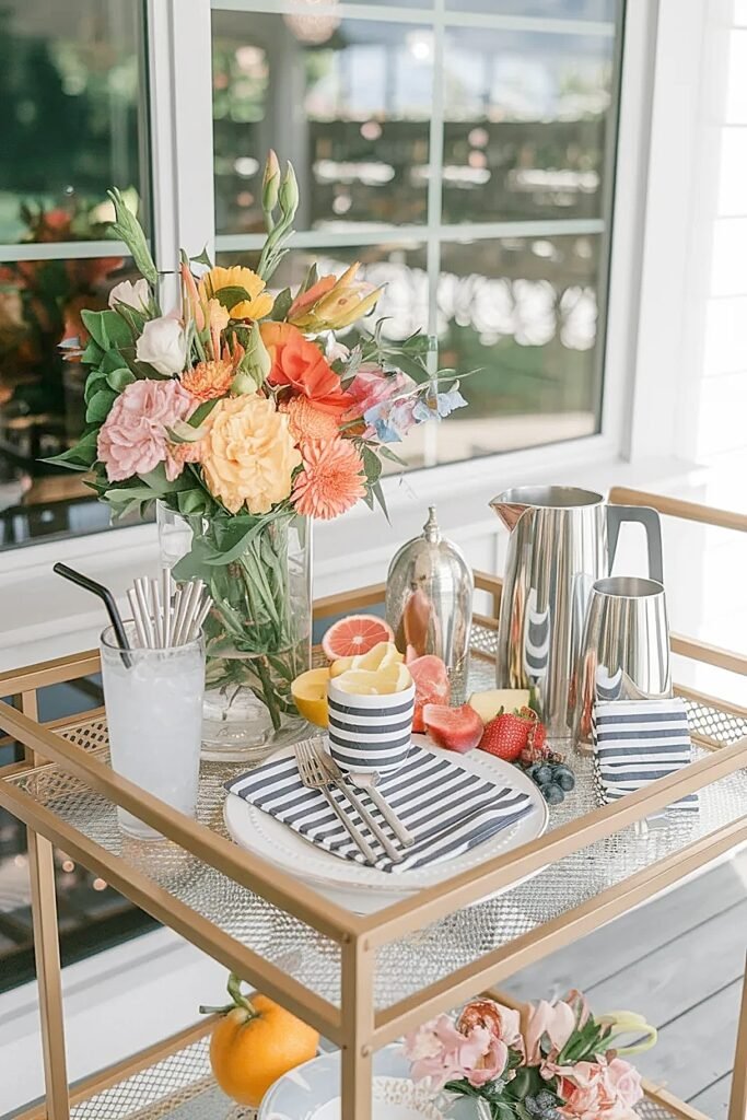 A bar cart is the most social surface on a back deck at any birthday. Guests cluster around it, spend more time near it than anywhere else, and look at it at close range while they wait for drinks. It is also completely overlooked as a flower styling opportunity in almost every outdoor birthday setup I have ever seen.