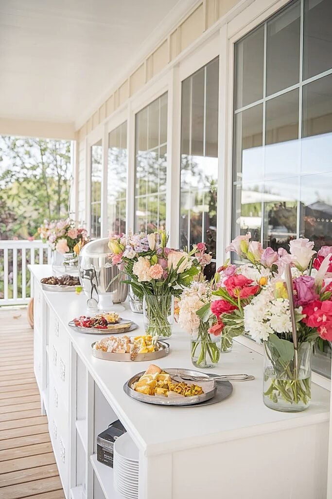 Back deck buffet tables are the most demanding flower styling challenge in the entire outdoor birthday setup. The food zone spans the full length of the table, guests are reaching across it constantly, and unlike the dining table, the buffet is in active use the entire party without any natural break to adjust or refresh arrangements.