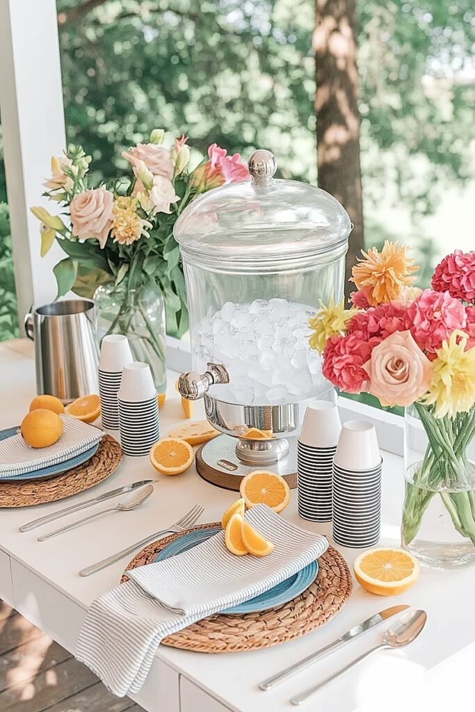 2. Herb and Bloom Jar Trio Set three small, gravel-weighted jars in a tight cluster at the back corner of the beverage station. Fill each with a mix of one grocery store herb and one summer bloom: mint and a zinnia, rosemary and a marigold, basil and a small sunflower face. The herbs add fragrance that makes the entire beverage station area feel more intentional and inviting, they function as drink garnishes throughout the party, and the weighted vessels hold position on a wet surface without sliding.
