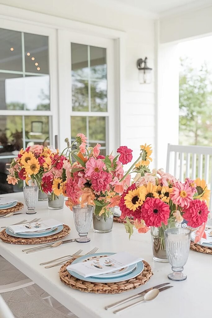 Small rounded groupings Gomphrena, daisies, compact zinnias Leave room for drinks, snack plates, and guest elbow space.