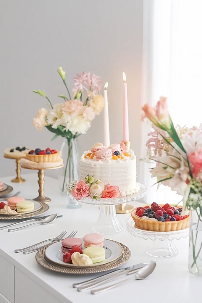 Flowers on a brunch dessert table enhance the pastry display, not compete with it. One small arrangement at each end, center clear for the birthday cake.