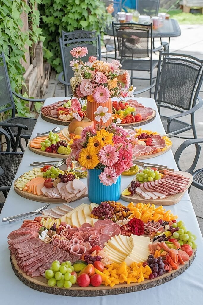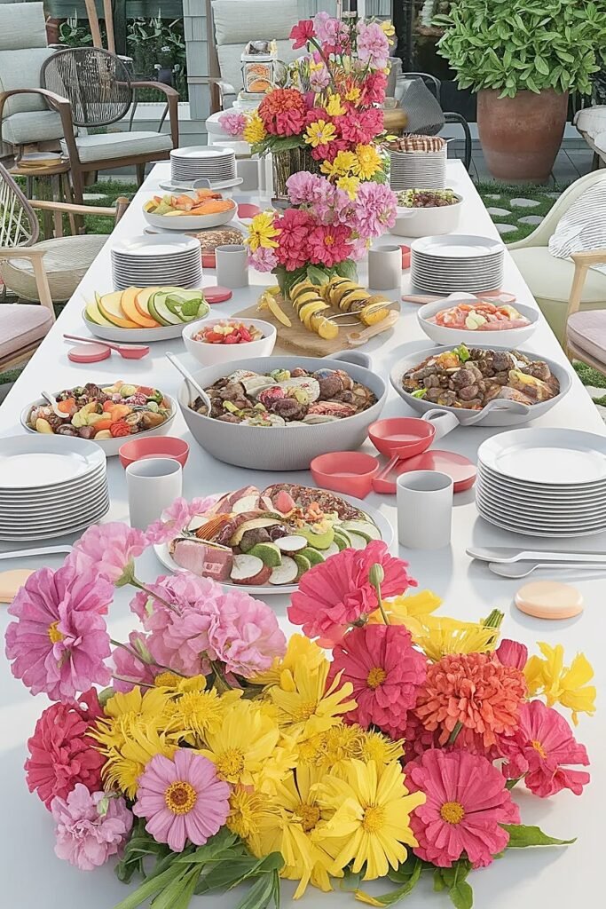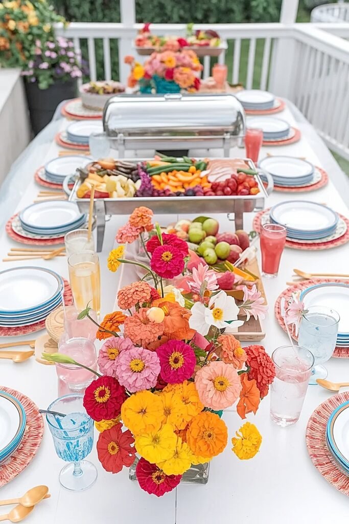 Zinnias and marigolds from any grocery store cover the full practical brief. Start with those, build the back-edge framework, then refine from that foundation. The buffet table is the one party surface where the food is the centerpiece. The flowers frame it. That supporting role, played well, is exactly what makes the whole setup look like it was designed by someone who understood what they were doing.