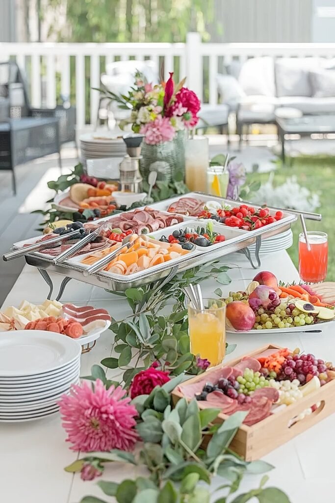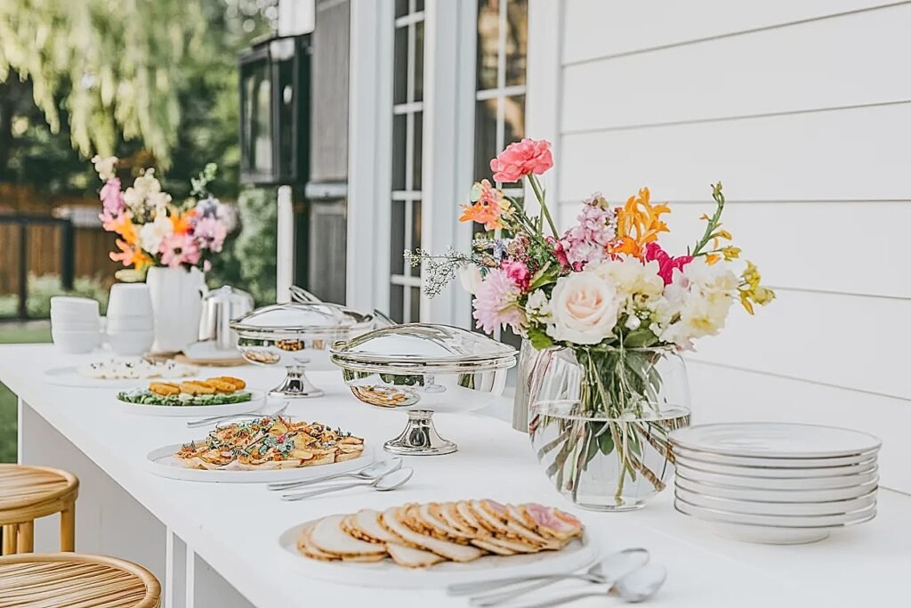 One technique worth using specifically at outdoor buffets: build the flower arrangement at the back edge and then load the food around it rather than the reverse. Setting the flowers first and then building the food display outward from them ensures the flower zone never gets crowded by serving dishes that drift backward as the table fills up. It sounds obvious. Most people do it the other way and wonder why the flowers ended up inside the mac and cheese.