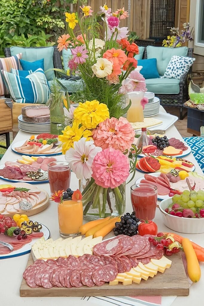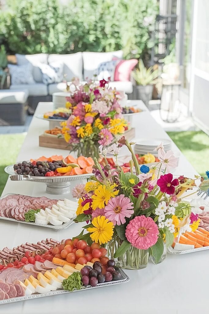 Ideas for Bright Summer Flowers on a Backyard Patio Party Buffet Table