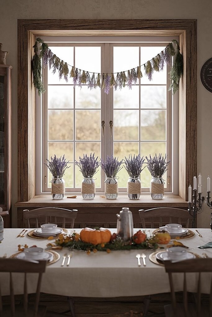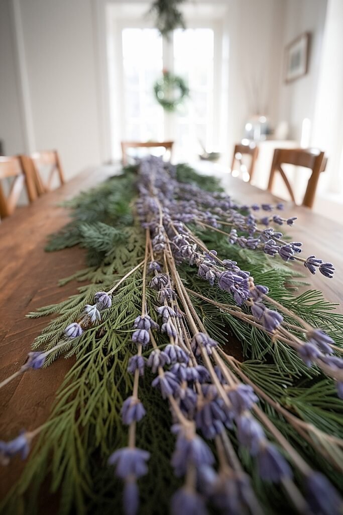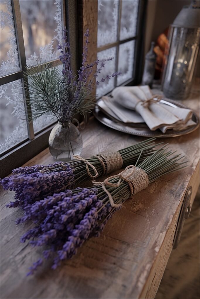 - Windows, sideboards, mantels: repeat lavender-pine motifs.