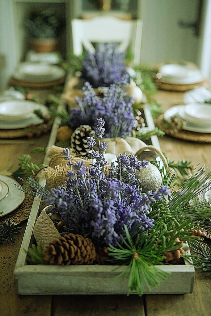 Next, I shift surfaces. Out go matte harvest plates under candles; in come mercury cups, frosted glass, or pewter saucers—cool reflectors that make lavender’s blue-violet bloom feel wintery. I sprinkle a handful of tiny pinecones at intervals, never rolling loose. If I want a focal, I crown the center with a low glass cloche and a single ornament on linen, ringed by micro lavender. The language changes from rustic abundance to quiet brilliance.