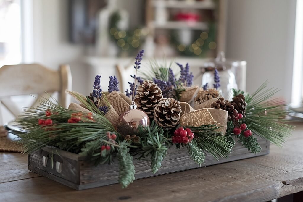 I begin by auditing the mechanics. If your centerpiece rides on jute, chicken wire ribbon, or an olive runner, keep that base. I remove wheat, gourds, and any food-adjacent accents. I shorten visible lavender bundles, burying stems deeper so scent softens and the line remains. Then I add short fir or cedar tips along the spine to thicken shadow and invite candle glow to pool rather than blast.