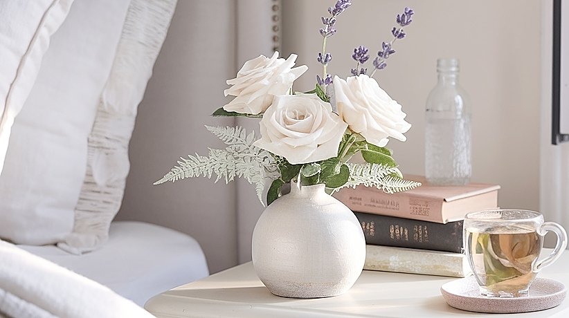 - Bedside Rose Bud Bouquets – Place dainty rose bud nosegays on each nightstand for waking up to fresh, feminine style and soothing natural scents.