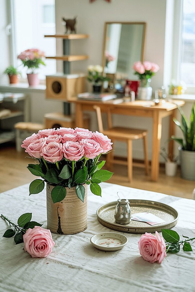 Position Valentine roses in identified safe zones: high mantels, tall bookshelves, surfaces behind furniture barriers, locations without nearby launching platforms for cats. The roses remain visible and beautiful while staying beyond casual pet contact. A centerpiece on a high shelf creates the same romantic impact as one on a coffee table, arguably more, since elevated arrangements draw eyes upward and feel intentionally styled rather than casually placed. For more creative placement ideas in challenging spaces, explore these Valentine rose decor solutions for small nooks and breakfast corners that adapt well to pet-safe positioning. Know other pet owners planning Valentine decorating? Share this post with them!