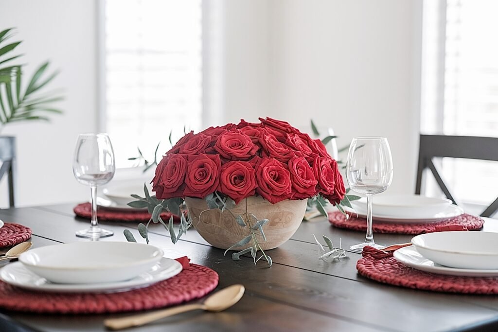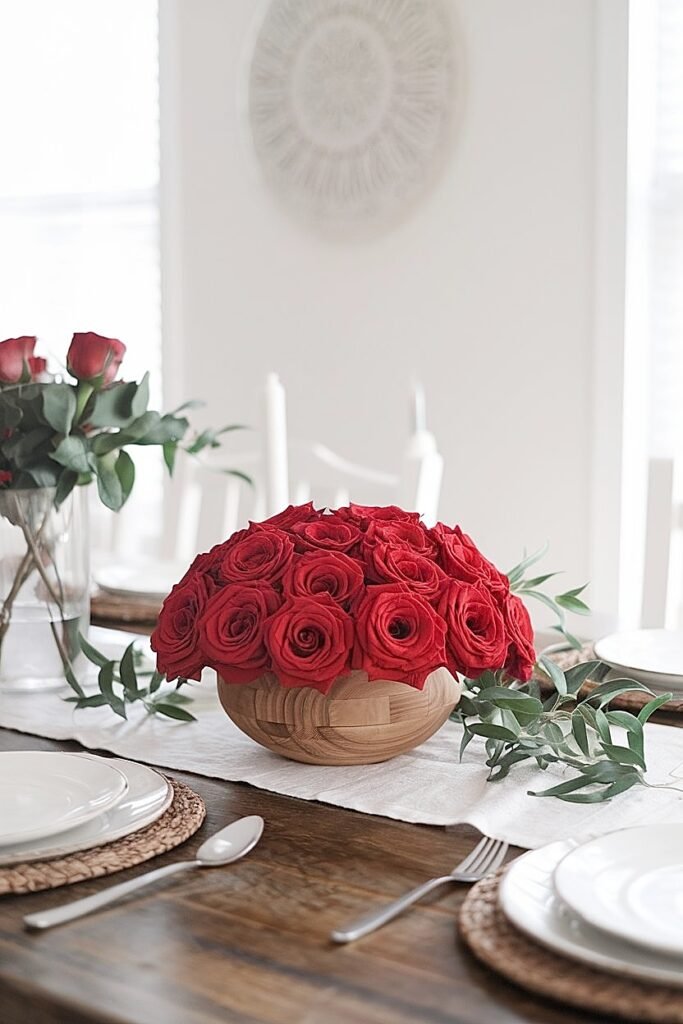 Build your arrangement low and long, following the dough bowl’s natural proportions. Insert roses at slight outward angles so heads face the bowl’s long edges rather than straight up. Fill the length of the bowl rather than concentrating in the center. Tuck greenery around rose bases to hide foam and soften transitions between flowers and wood. The finished piece should measure under six inches tall while spanning the bowl’s full length, substantial presence without vertical obstruction. For more clutter-free centerpiece approaches, explore these Valentine rose ideas for coffee tables without clutter that share similar low-profile principles. Found this approach helpful? Share with friends who appreciate rustic styling!