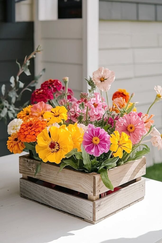 Container-friendly summer guidance supports zinnias and marigolds as strong seasonal performers for sunny patio containers. :contentReference[oaicite:3]{index=3} Use one strong main bloom and repeat it around the crate instead of mixing too many focal flowers.