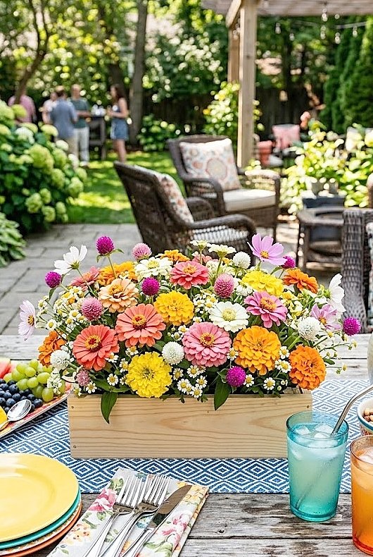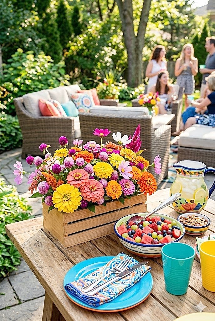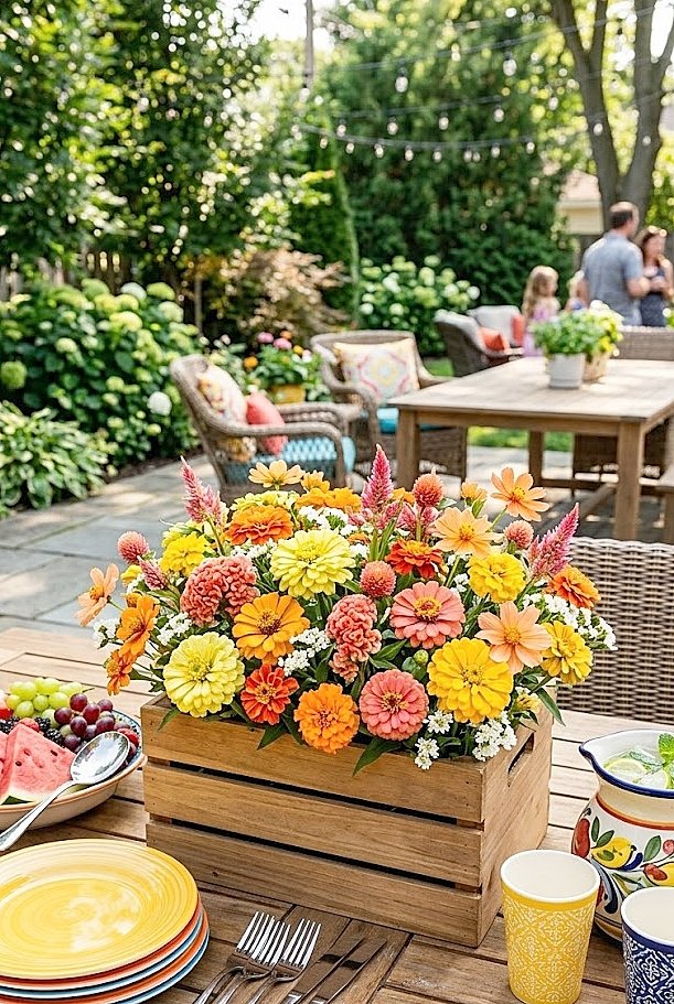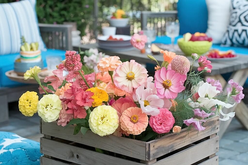 What Are the Best Summer Flowers for a Food-Friendly Wooden Crate Backyard Patio Party Arrangement?