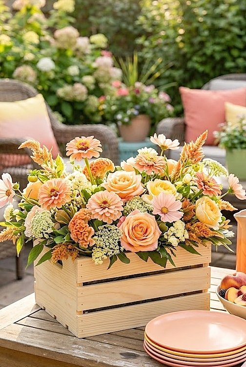 Ideas for Soft Sunset Summer Flowers in a Wooden Crate for a Backyard Patio Party