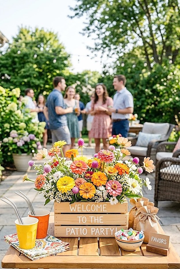 For outdoor patio party setups that use multiple vessel types beyond the crate, including wicker baskets at entry points and along buffet edges, check out wicker basket summer flower arrangements for a backyard patio party for a complementary approach. Share this with anyone planning a patio party this summer. More ahead on every specific flower choice and crate styling technique.